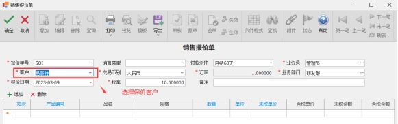 2)选择报价的客户,选择后将自动带出币别,税率等信息
