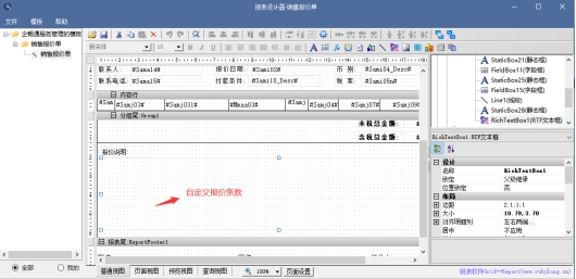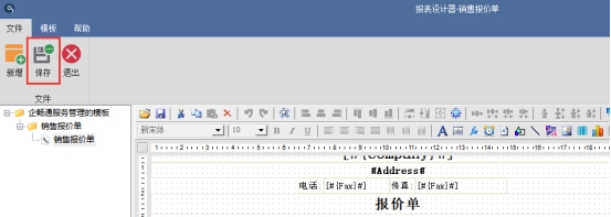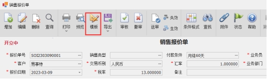 报价单打印模板可以自定义设计,在报价单页面点击“模板”按钮打开模板设计。详细模板设计请参见 模板设计器