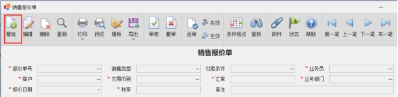 1)根据客户报价需求,进入报价单进行报价单录入 点击“增加”按钮进入新增模式,此时的栏位将变成允许输入