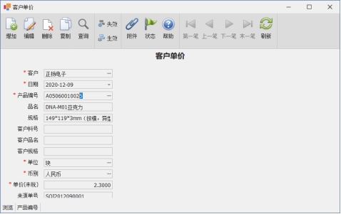 销售报价单在审核后,会将单价抛转到此。也可以直接查询或新增客户的报价记录。本步骤会保存客户的产品料号和产品品名等信息。可通过以下两种方式产生客户产品单价资料:手动输入,报价单转入。