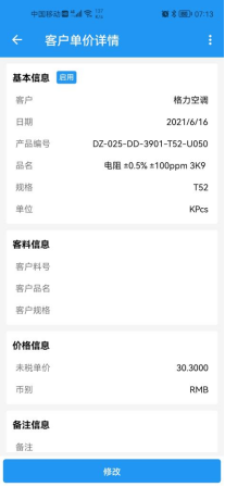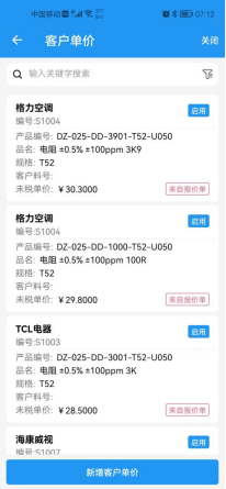 在App中可以快速建立客户单价或编辑和删除单价资料,App中快速新增客户单价后,将会在销售下单时自动带出单价。