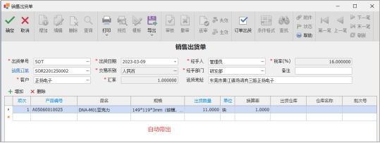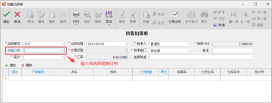 在此模式下,出货单可以按照订单出货并自动带出未出货的订单明细,此种情况下,一张出货单只对应一张销售订单,如果需多个订单合并到一张出货单上出货请参见下一步骤“合并订单出货”。