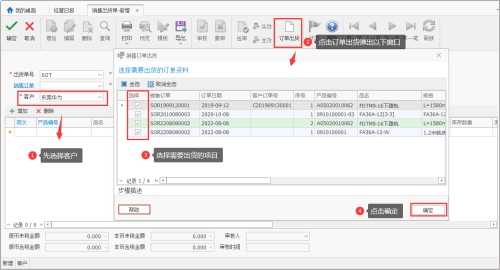 1)首先选择客户,销售订单栏位是无需输入的,在新增的画面中点击顶部的“订单出货”按钮,挑选出需要出货的订单号即可将多张订单合并到一张出货单上 ,挑选窗口将只会显示可以出货的订单明细。