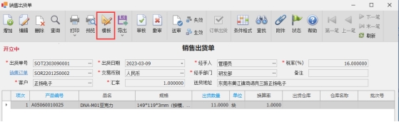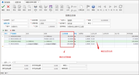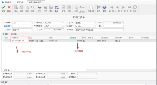 2)选择出货产品,在产品编号栏位输入或选择,然后输入数量和出货仓库即可完成出货单录入