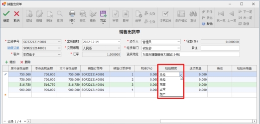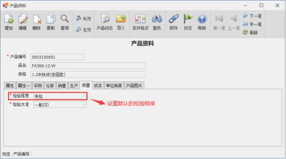 说明:可以在产品资料进行默认的质量检验设定,设定好检验程度后,将在出货时自动预设检验程度,例如设置为免检,则在出货时默认为免检。