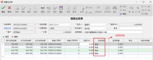 即便产品设置为需要检验,也可以在出货单中强行修改为无需检验。在出货单界面设置检验程度为“免检”则此出货单无需检验,可以直接审核后出库