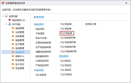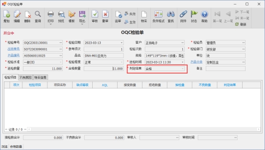 1)进入【质量管理】-【质量检验】-【OQC检验单】进行质量检验,详细的质量检验单操作说明请参见 质量管理系统的OQC检验章节