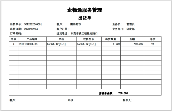 出货单打印格式默认提供两种打印格式,分别是A4纸张和针式打印机纸张,以下只列举针式打印机纸张格式,如有专门的格式需求,可使用模板设计器进行设计,详细的模板设计方法请参见 模板设计器