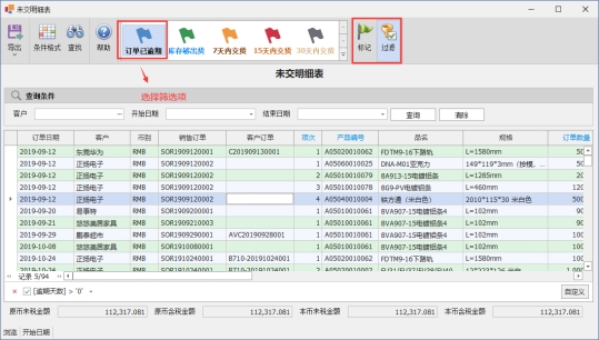 点击快速筛选栏即可显示符合筛选条件的订单,右侧的类型可选择“标记”或“过滤”,过滤则只会显示出符合条件的项目,标记则会显示全部但是会标记不同的颜色