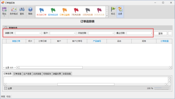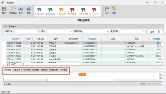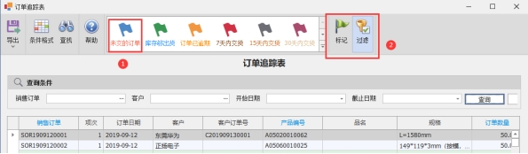 点击快速筛选栏即可显示符合筛选条件的订单,右侧的类型可选择“标记”或“过滤”,过滤则只会显示出符合条件的项目,标记则会显示全部但是会标记不同的颜色