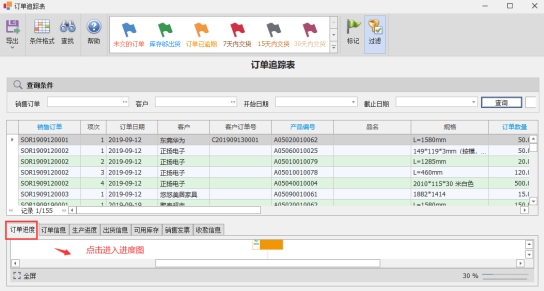 1)点击“订单进度”页签进入订单进度图画面,同时可以点击全屏来全屏显示订单进度图