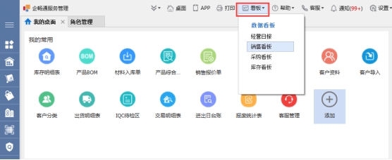 在主页界面顶部点击看板按钮,并在下拉框中选择“销售看板”打开销售看板