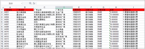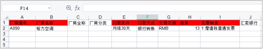 3)编辑EXCEL模板,根据上一步骤打开的EXCEL模板文件(如下图)进行资料填写。EXCEL中的红色列必须输入,例如厂商编号,厂商名称,付款条件等