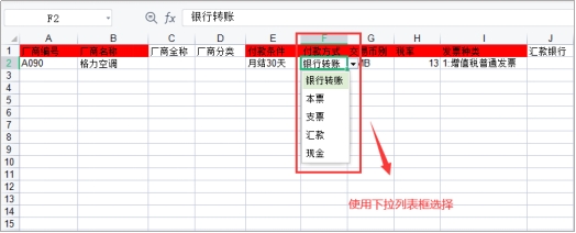 3.1)例如可以按照以下例子进行填写,其中“付款条件”,“付款方式”,“交易币别”,“发票种类”需要从下拉框中选择,请不要自己填写,否则会导入失败。