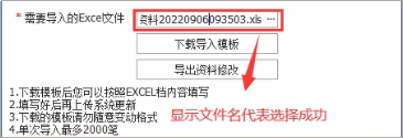 4)上传模板,在“供应商导入”功能中选择需要上传的模板(如下图),如果导入成功则会显示文件名称(如下图)