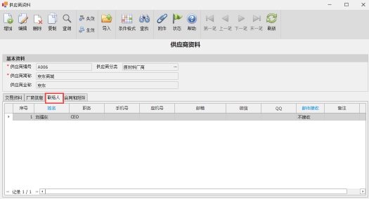 当供应商存在多个联络人时,可在供应商资料中设定多个联络人,设置后可产生供应商通讯录