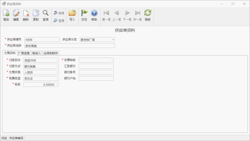 管理供应商基本资料,作为采购管理系统,应付账款的主要对象。本系统主要管理供应商的编码,名称,分类,交易信息,账务信息,财务信息,联络人信息,合同附件等。使用供应商管理系统能直观明了的管理供应商名册