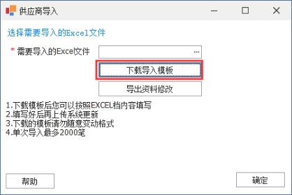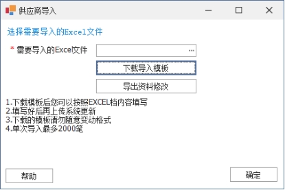 使用EXCEL文档模板填写资料来批量导入供应商资料或者导出供应商资料到EXCEL里批量修改后更新。