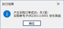 4)录入采购单信息,如果没有特殊要求,保持默认,直接点击确定即可。之后将提示转入采购的结果,如下图: