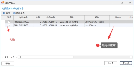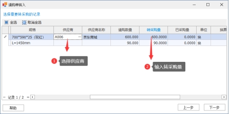 3)勾选需要转采购的项目,并输入“供应商”和“转采购量”栏位,输入完后点击下一步。