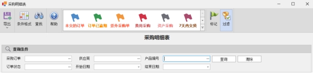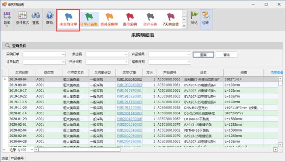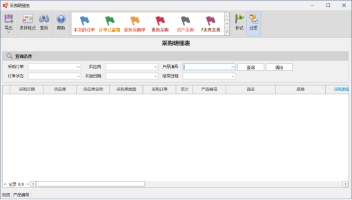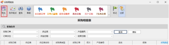 查询和导出采购订单明细,使用订单明细表可以快速筛选订单未交,订单逾期,订单关闭等状态