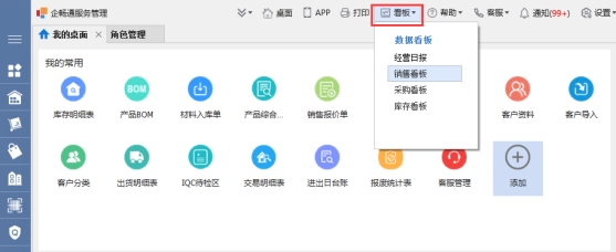 在主页界面顶部点击看板按钮,并在下拉框中选择“采购看板”打开采购看板
