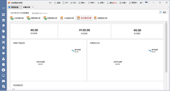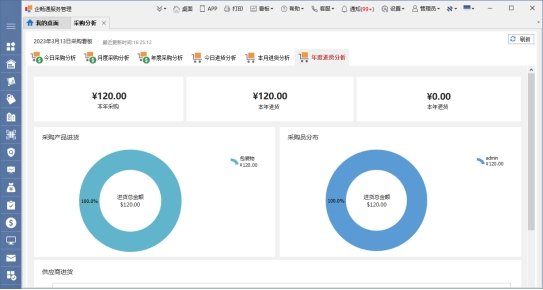 年度进货分析统计本月采购进货金额,年度下单金额,退货金额。按照产品分类统计接单,按照采购员统计采购额,按照供应商接单金额进行图例分析