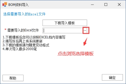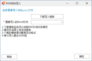 5)上传模板,上传模板前请先关闭上一步骤的EXCEL模板文件,在“BOM导入”功能中选择需要上传的模板(如下图),如果导入成功则会显示文件名称(如下图),点击确定开始上传模板,如果导入成功会显示以下信息,如果导入失败将弹出失败提示。