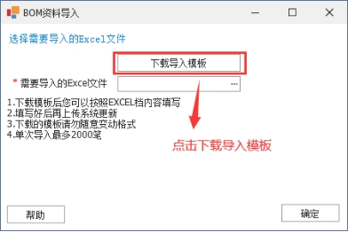 1)下载新增导入模板,在“BOM导入”功能界面,点击“下载导入模板”按钮(如下图)