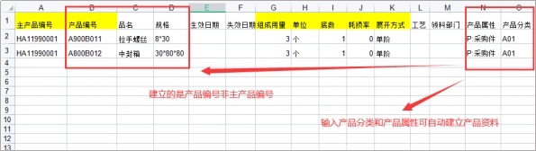 BOM模板导入的同时允许自动建立产品编号(注意:是建立子件料号而不是主件编号)。需要在BOM导入模板中填入“品名”,“规格”,“产品分类”,“单位”等信息。如果不使用模板自动建料,可先在产品资料导入功能中建立产品资料后再整理进入BOM模板