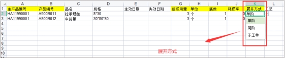 BOM导入模板中的展开方式有单阶,尾阶,子工单三种选项。展开方式用于在BOM存在多层级的情况下,指定生产时的物料的展开方式。