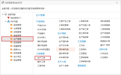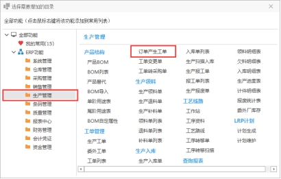 1)从【生产管理】-【产工单管理】-【订单产生工单】路劲找到本功能入口并打开功能