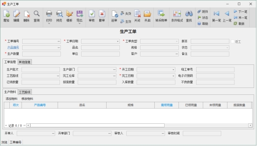 生产工单是生产部门的生产指令单,简称工单。工单包括了基本的生产资料,例如产品,数量,需求时间,工艺路线等信息。