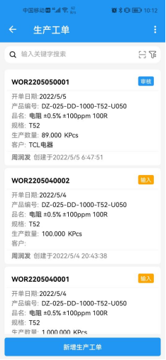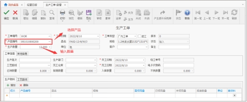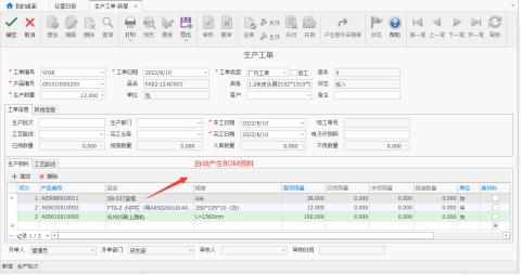 生产工单新增时,必须输入产品编号和生产数量,输入两个必要信息后,如果存在BOM资料则会自动带出工单物料需求明细