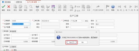 1)产品无BOM时,选择料号后,将弹出提示,点击“是”即可继续下一步