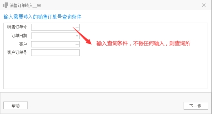 2)在主画面上输入需要转入工单的订单条件,例如工单号,工单时间等,如果不输入任何条件,将查询所有工单。点击下一步后进入销售订单选择界面