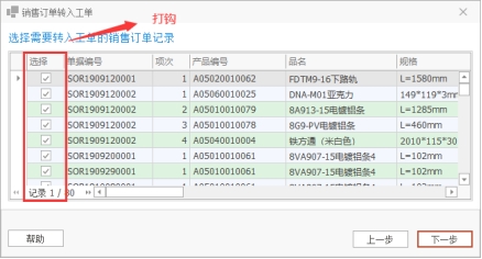 3)勾选需要转入工单的销售订单项目然后点击下一步即可完成抛转