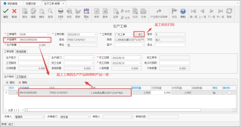 返工工单是将成品领出返工,返工过程可添加其他材料。返工工单的特征是生产产品和材料需求产品是一致的,在此模式下系统将自动判定为返工,返工工单成本遵循不重复计算的规范。