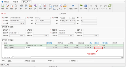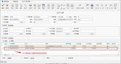 2)返工工单单身资料需要自行维护需领数量,系统并不会自动产生,同时如果需要增加其他辅助物料则可手工增加,返工工单需领物料必须有上级生产物料,如果没有系统将不会判定为返工工单,而自动设置成一般工单