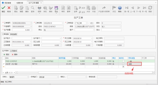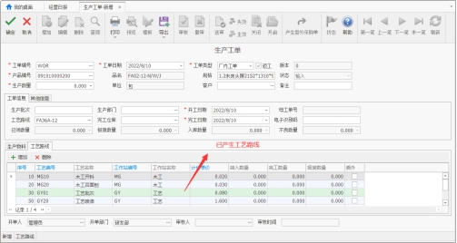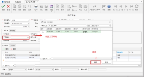 1)指定工单工艺路线,在“工艺线路”栏位选择一笔工艺资料,工艺路线资料在“工艺路线”功能中维护并审核方可使用