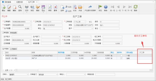 按照BOM设定,如果将展开方式设定成“子工单”,在工单开立时将自动产生此工单的下级工单,此时当前工单称之为母工单,产生下级的工单称之为子工单,子母工单相串联。