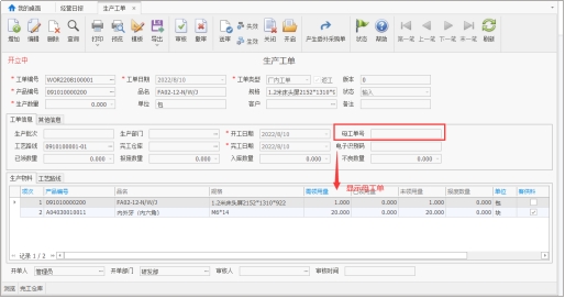 2)在子工单查看母工单,一个子工单只对应一个母工单,点击母工单号的蓝色字体可以跳转到母工单号界面