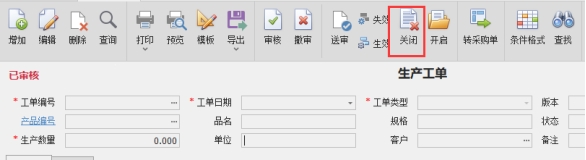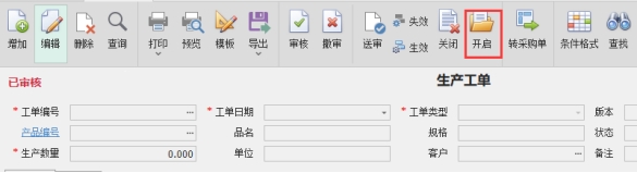 如果工单不需要再使用,可以使用关闭功能来关闭工单,关闭后的工单将无法再领料,入库,转移等操作,如果启用成本系统,关闭工单意味着当月将工单成本转出。关闭工单前请确定物料已经处理完毕。如需重新开启工单则可点击开启按钮进行重新开启