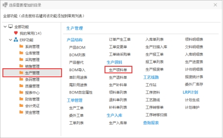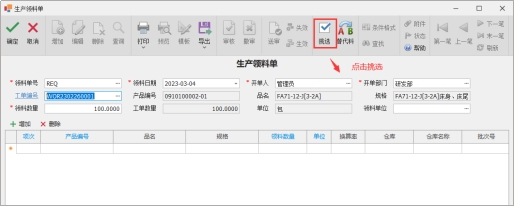 可以使用“挑选”功能来批量挑选需要领料的产品