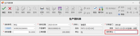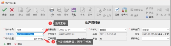 1)录入领料单时,首先输入工单编号和生产数量,输入两个信息后,将自动带入其他的信息。