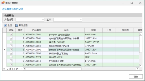 3)选择需要领料的产品默认勾选全部,可以在快速筛选区域筛选需要领料的产品,点击确定将自动带入单身。