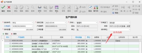4)补充缺少仓库的栏位,补入后将自动显示仓库库存用于快速判断是否欠料