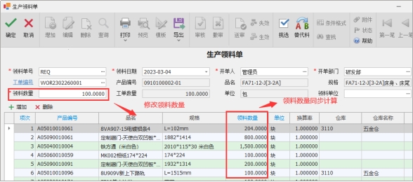 领料数量,领料套数,输入领料套数自动计算物料需求数量  |