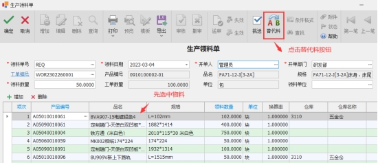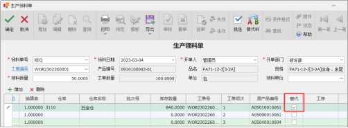 生产领料单允许在领料的时候按照BOM设置的替代资料来使用替代发料,针对通用性比较强的物料,可以在发料时灵活替代。
