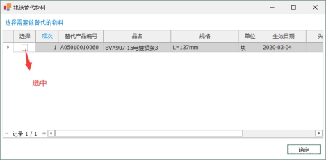 2)在弹出的替代窗口中选择需要的替代料,选中物料点击确定,如果此窗口没有任何数据,则代表需要进入BOM设置替代关系